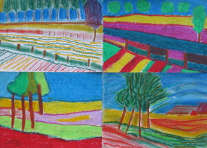 2022Vier landschappen gecombineerd tot een geheel. Alles gemaakt met pastelkrijt en geinspireerd door het werk van Vicent Van Gogh en Etel Adnan.